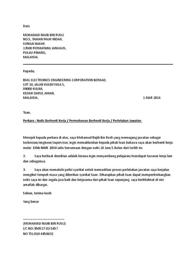 Merujuk kepada perkara di atas, saya. Sebelum mengundurkan diri, ribuan terima kasih . Surat berhenti kerja notis sebulan. Contoh surat berhenti kerja 2 minggu have a graphic associated with the other.contoh surat berhenti kerja 2 minggu it also will feature a . Saya (nama pekerja), bekerja di (nama syarikat) memegang jawatan (nama jawatan) ingin memberitahu pihak tuan bahawa saya akan berhenti kerja mulai tarikh ( . Nama · alamat majikan tarikh. Bertugas sebagai account officer ingin memaklumkan kepada pihak tuan/ .
